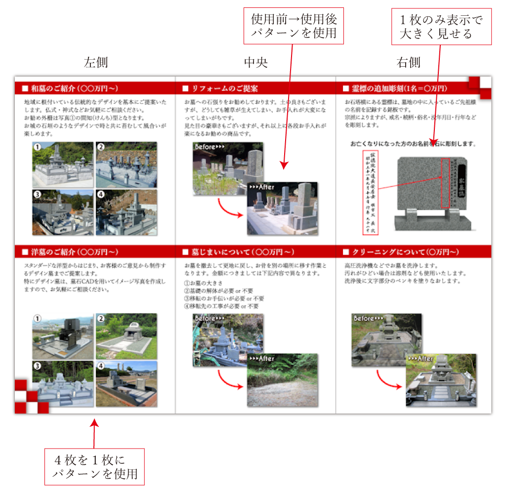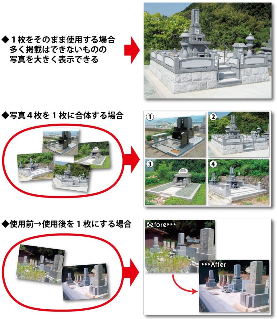 掲載に限りがございますので、下記ひな形で複数の写真を1つにまとめて掲載することができます。